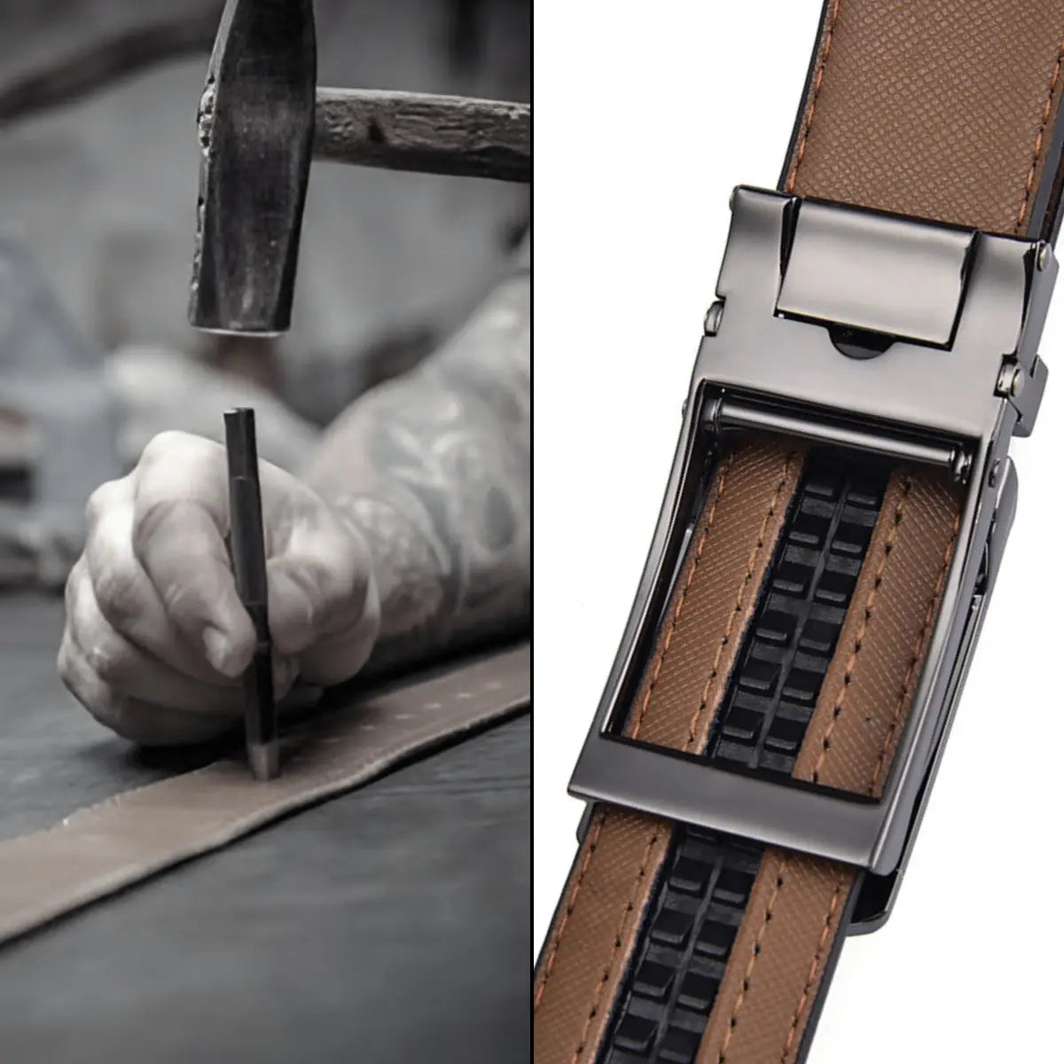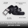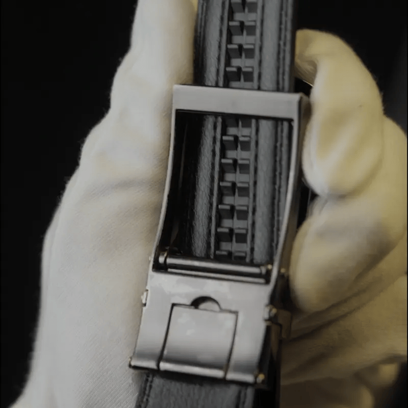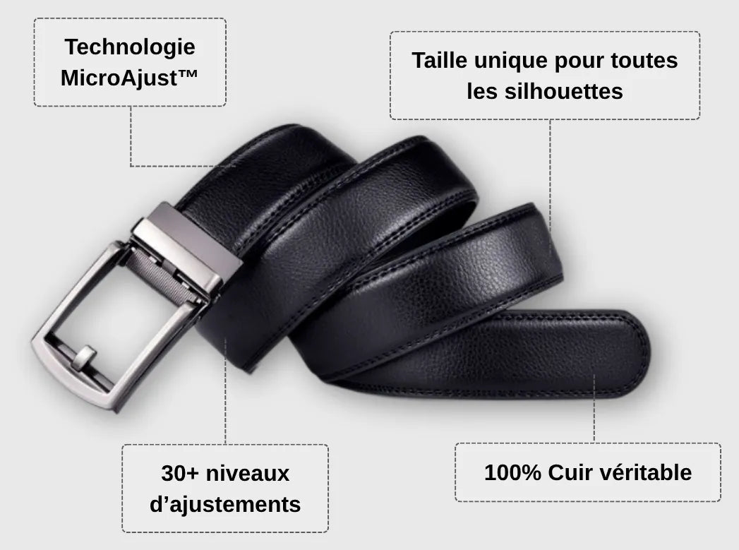 La ceinture utilise un mécanisme de crémaillère avec des micro-crans sur la face interne du cuir.